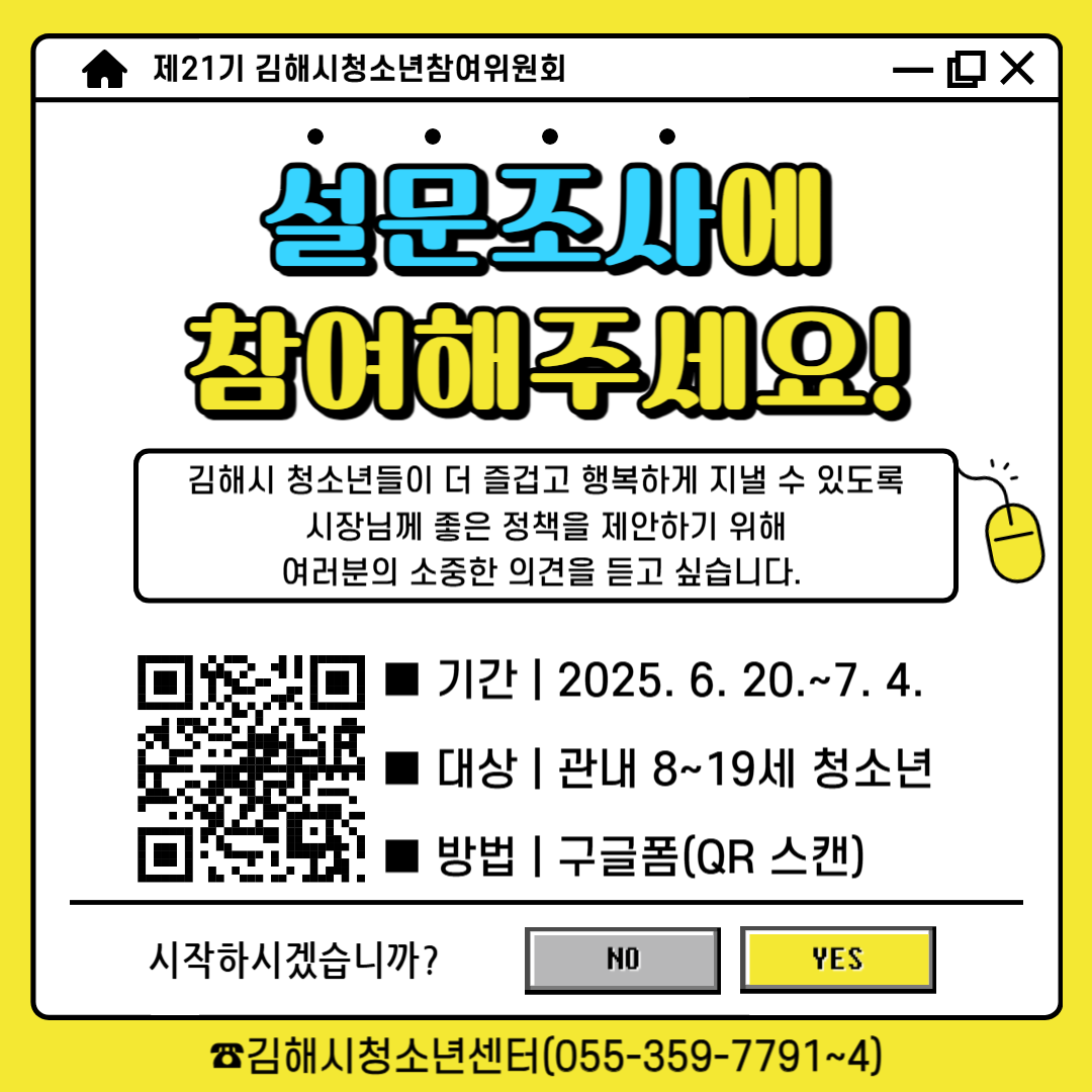 *설문 개요* 1) 기간: 2025. 6. 20.~7. 4. 2) 대상: 관내 8~19세 청소년(김해에 살거나 학교를 다니는 청소년) 3) 방법: 구글폼https://forms.gle/yUUvr3RyhU7Du44J9